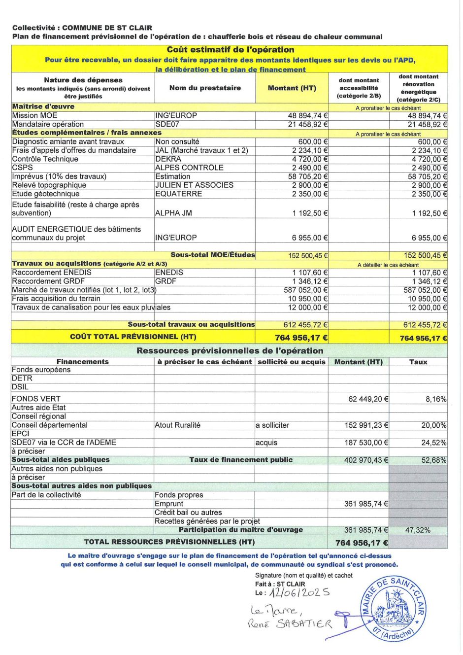 Plan de financement prévisionnel de l'opération de la chaufferie bois et réseau de chaleur communal